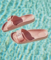 Birkenstock Arizona Shearling Sandals. An icon of timeless design and legendary comfort, the Arizona sandal has been defining style since 1973. The laid-back look comes in durable Birkibuc® for a brushed, leather-like finish. Complete with legendary Birkenstock design elements, like a contoured cork-latex footbed for the ultimate in support. Shearling lining. Two adjustable straps with metal pin buckles. Imported.