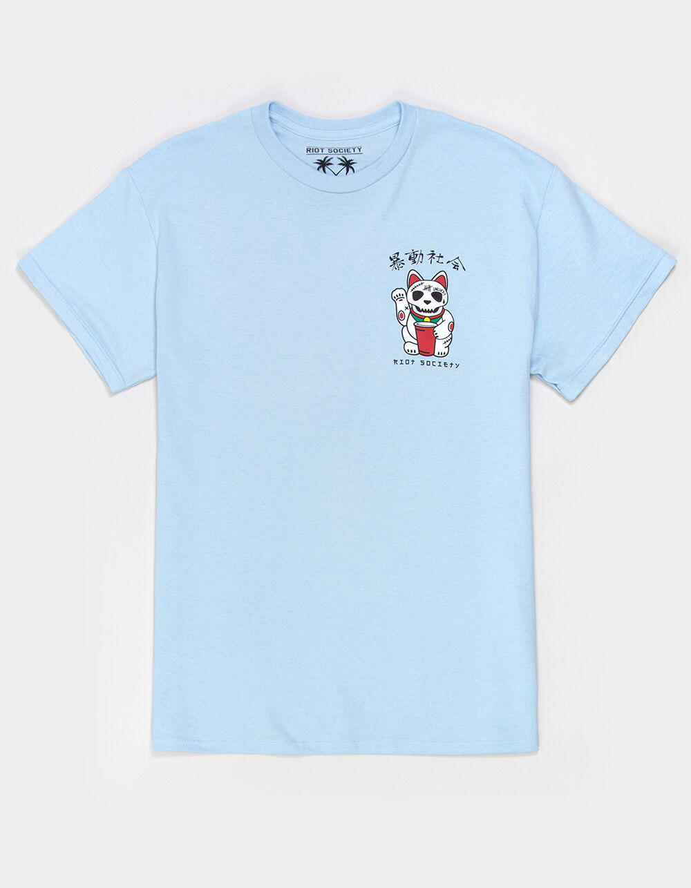 A multi-colored cotton tee featuring a lucky cat graphic, perfect for casual wear.