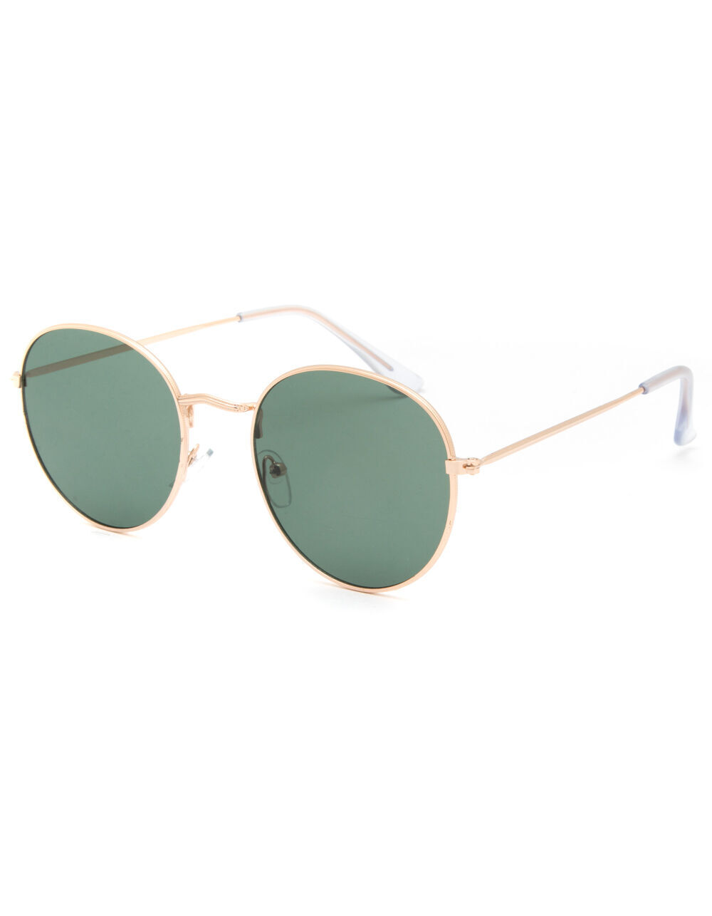 A pair of polished gold metal sunglasses with solid green lenses and adjustable nose pads.