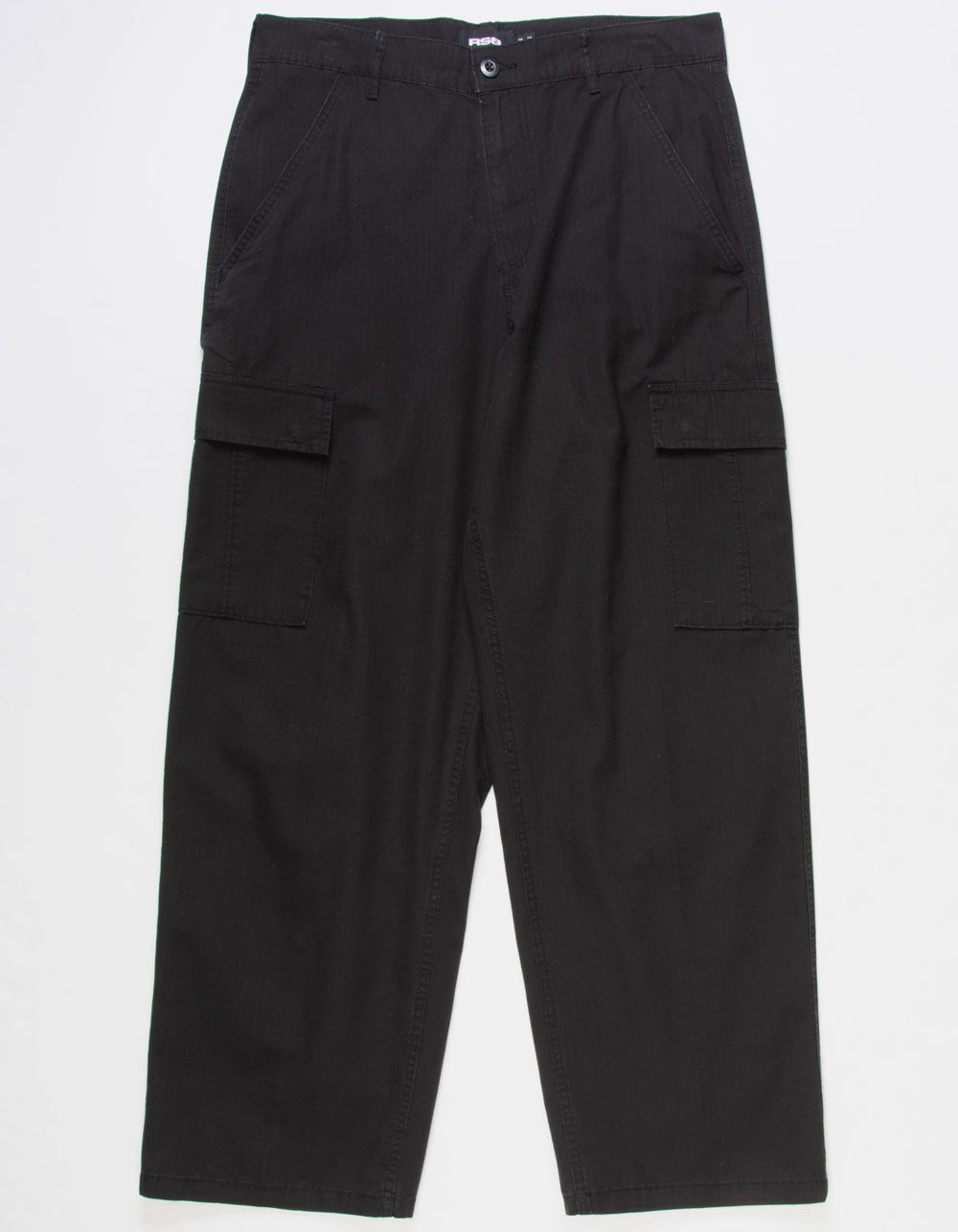 A pair of washed black, straight-leg utility pants with double knee patches and multiple pockets.