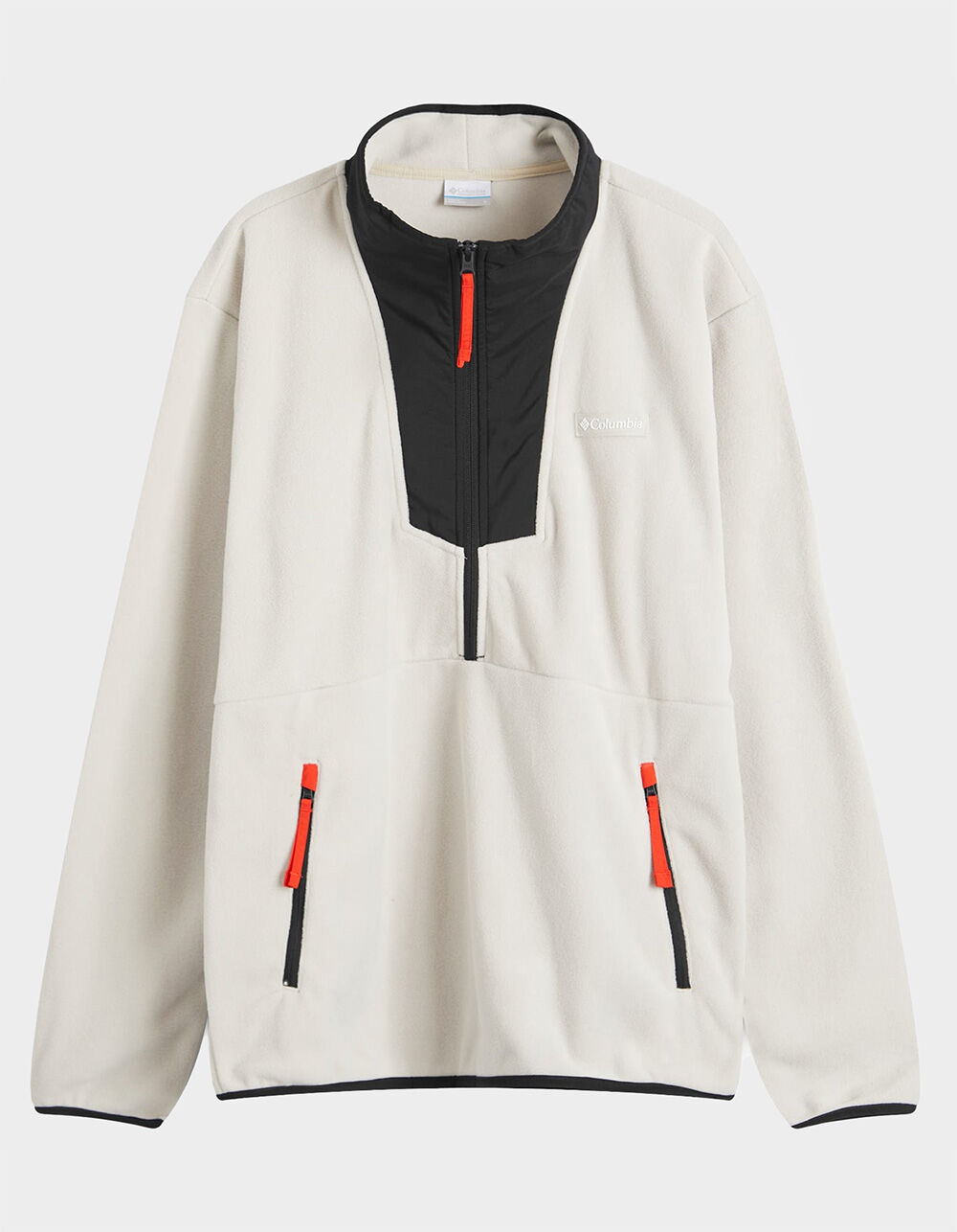 A cozy orange jacquard fleece jacket featuring an allover print, jersey lining, welt pockets, and zip closure.
