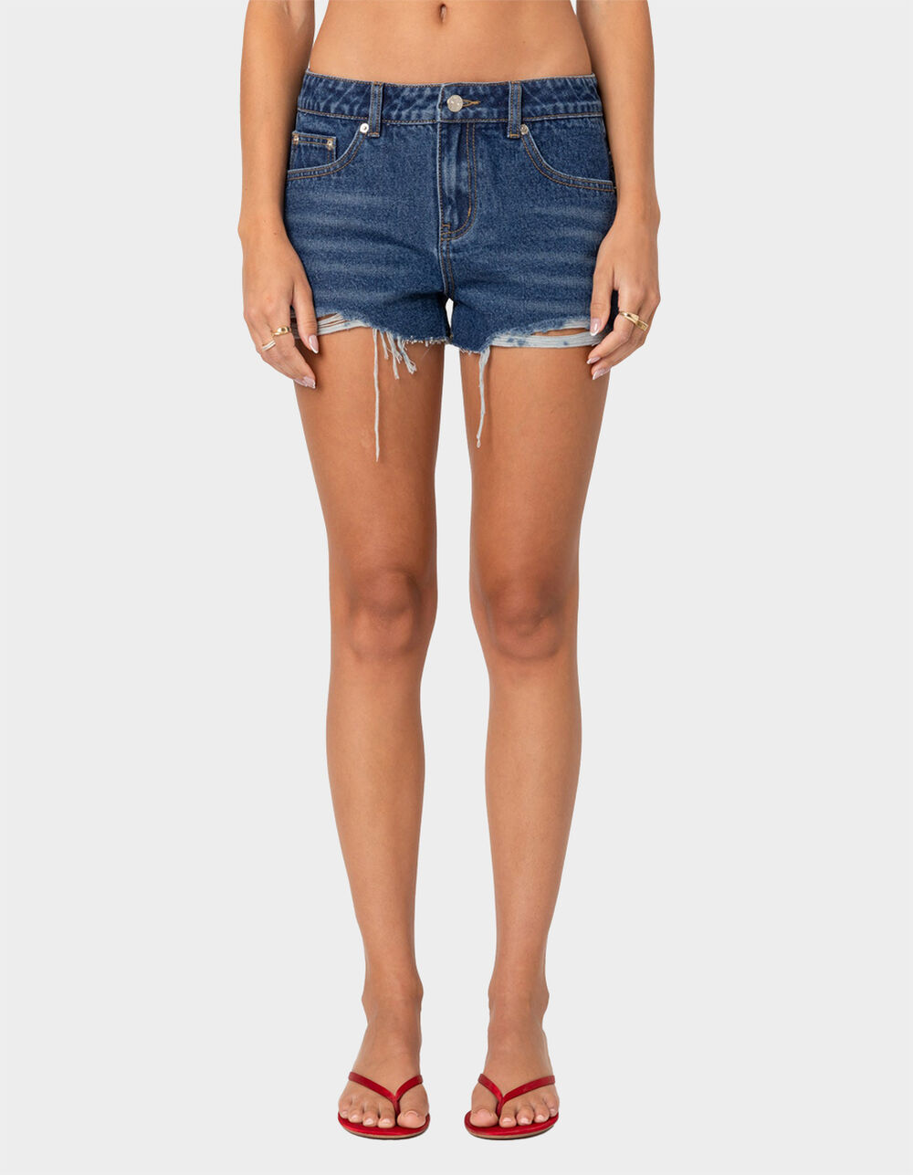 A pair of light blue, 100% cotton denim shorts featuring a low-rise waist and distressed hem.