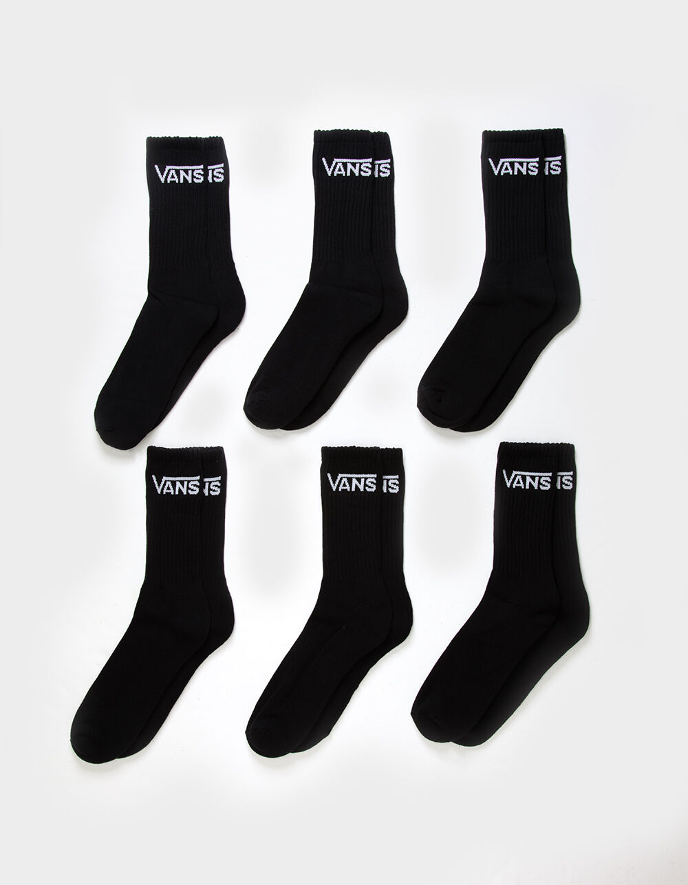 A pack of six black crew socks with seamless toe closure and jacquard logo design.
