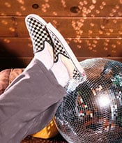 Vans Classic slip-on deck shoes. Canvas upper. Padded collar and footbed. Vulcanized rubber midsole. Vans side label. Rubber Vans Off The Wall heel badge. Gum rubber waffle outsole....
