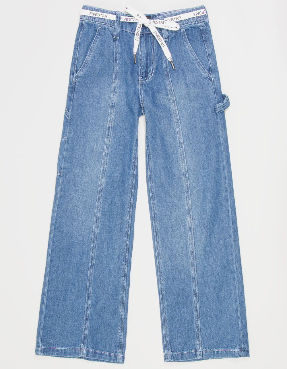 A stylish pair of low-rise, wide-leg jeans featuring a grommet waistband and lace-up front.
