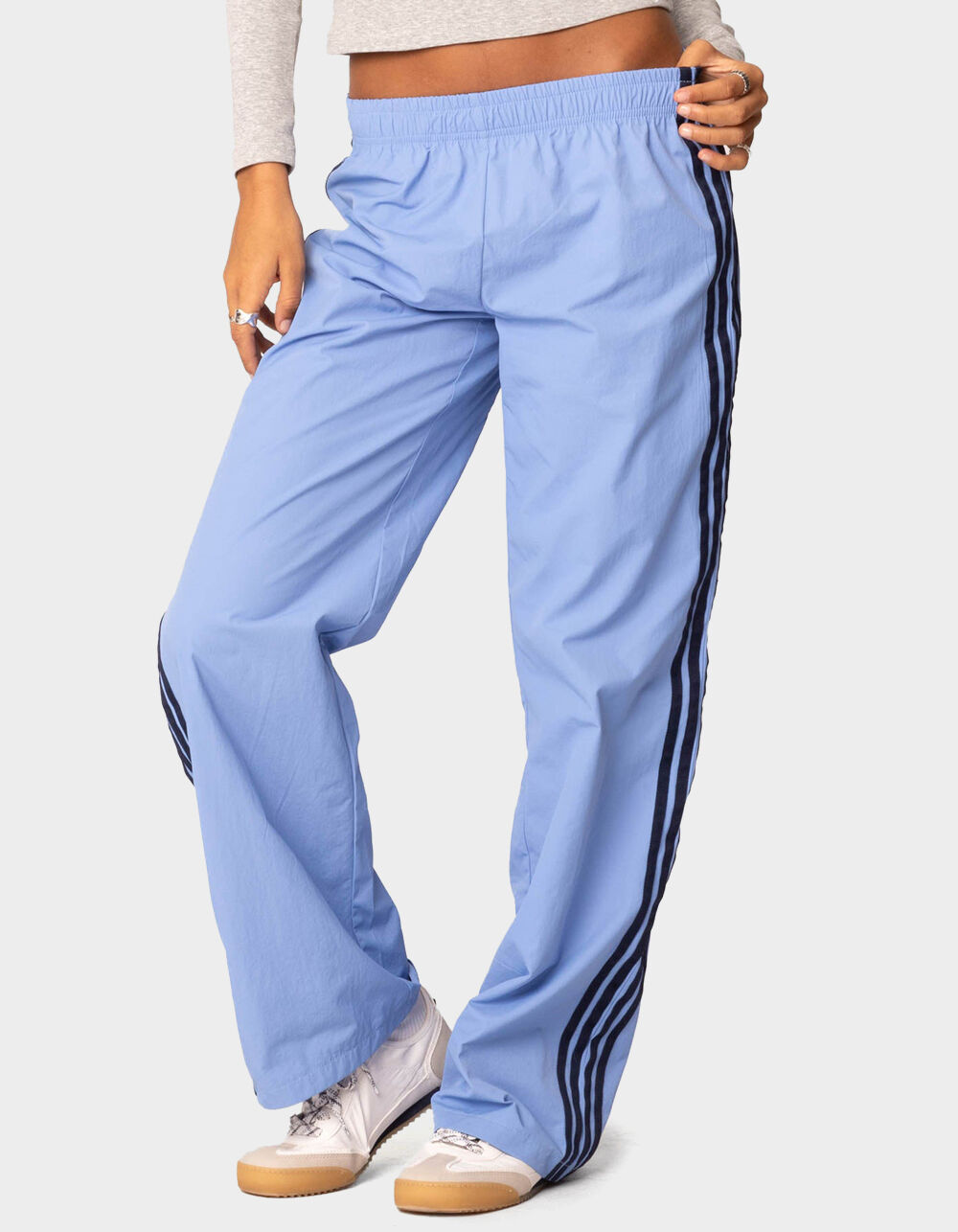 A stylish pair of blue nylon track pants with side stripes and an elastic waist for all-day comfort.