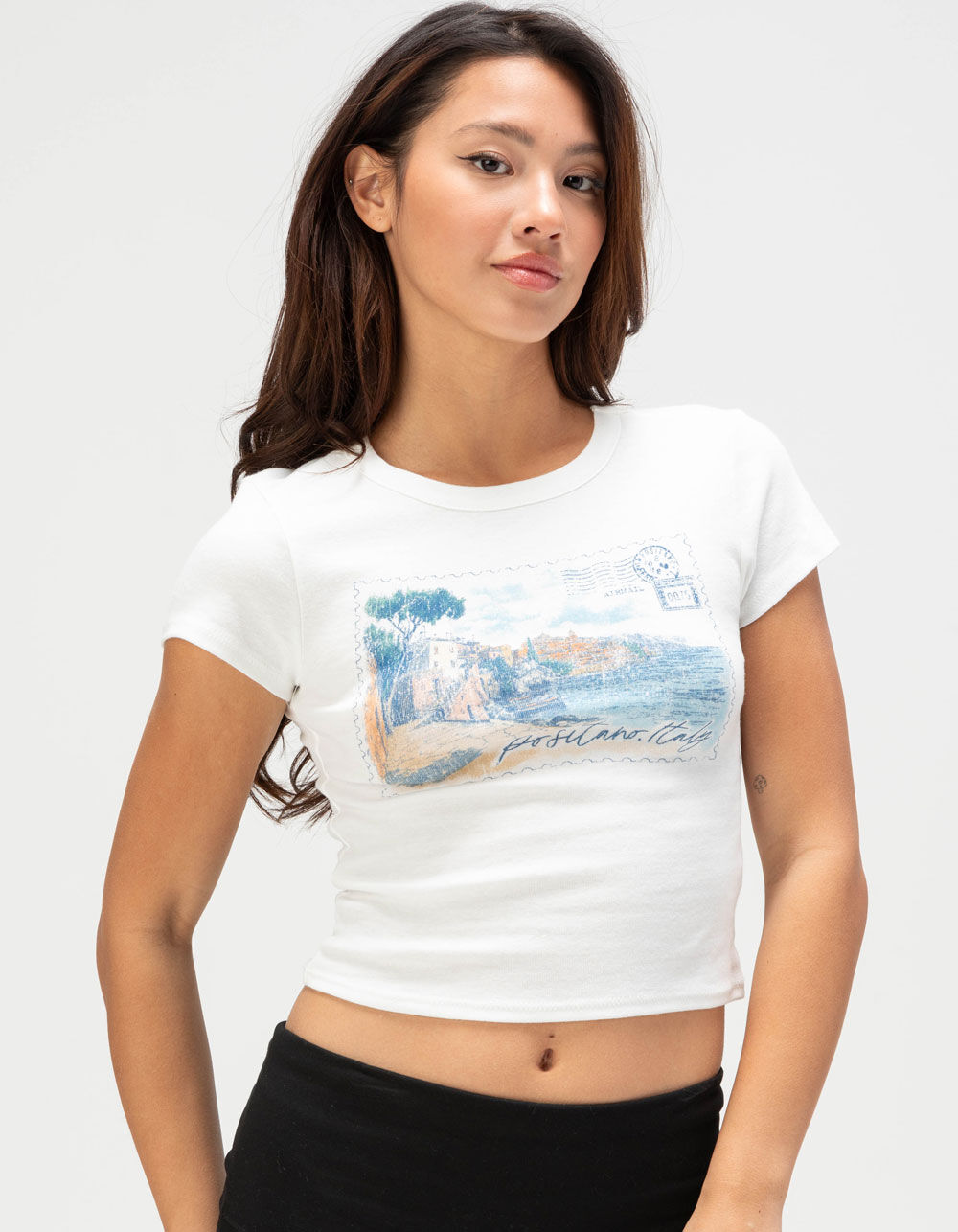 A white baby tee featuring front graphics, a crew neck, and a soft cotton-modal-spandex blend.