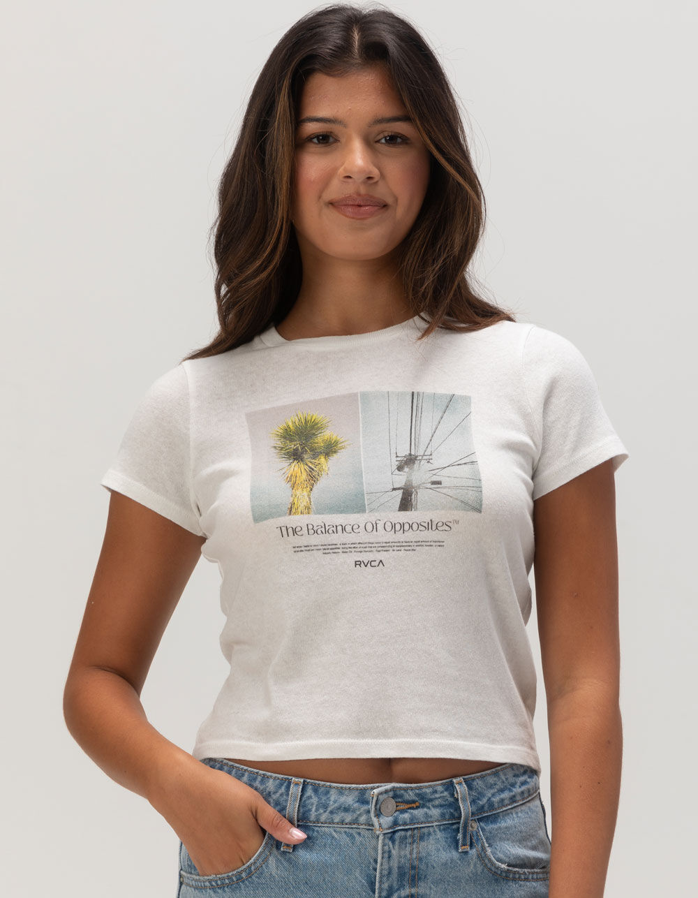 A versatile white baby tee with a scoop neckline, short sleeves, and a fitted, cropped silhouette.