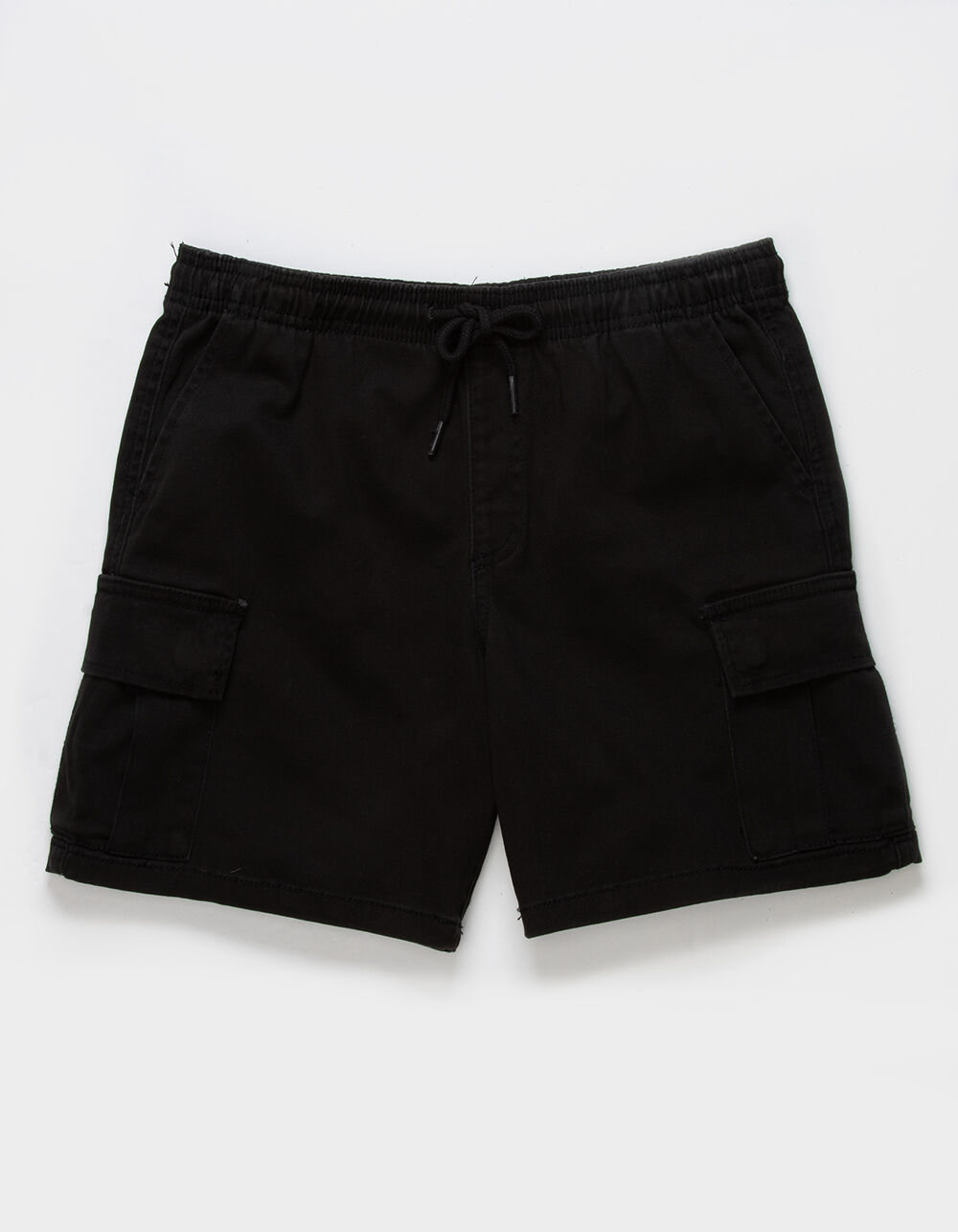 A pair of black nylon shorts with an adjustable waistband and multiple pockets for boys.